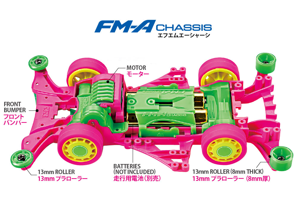 The FM-A chassis is a front motor unit with advanced aerodynamic themes whose center of gravity toward the front helps limit jump height. It comes equipped with a low-friction front skid bar and four rollers, which at the rear use an 8mm design. The chassis underside allows easy access to the motor and quick setup changes. Aircraft-inspired aero side stays allow attachment of a range of Grade-Up parts. The model includes 3.5:1 gears.