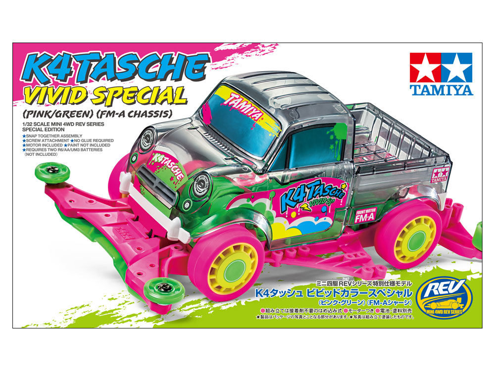 This assembly kit creates a Vivid Special version of the K4Tasche, a Mini 4WD racer with a retro pickup truck body molded in transparent light gray and featuring rounded headlights and a rear bed; you can even fit a Mini 4WD figure into the driverâs seat. The FM-A chassis offers superb stability, and comes in fluorescent pink with fluorescent green A parts. Stickers are included to decorate the car.